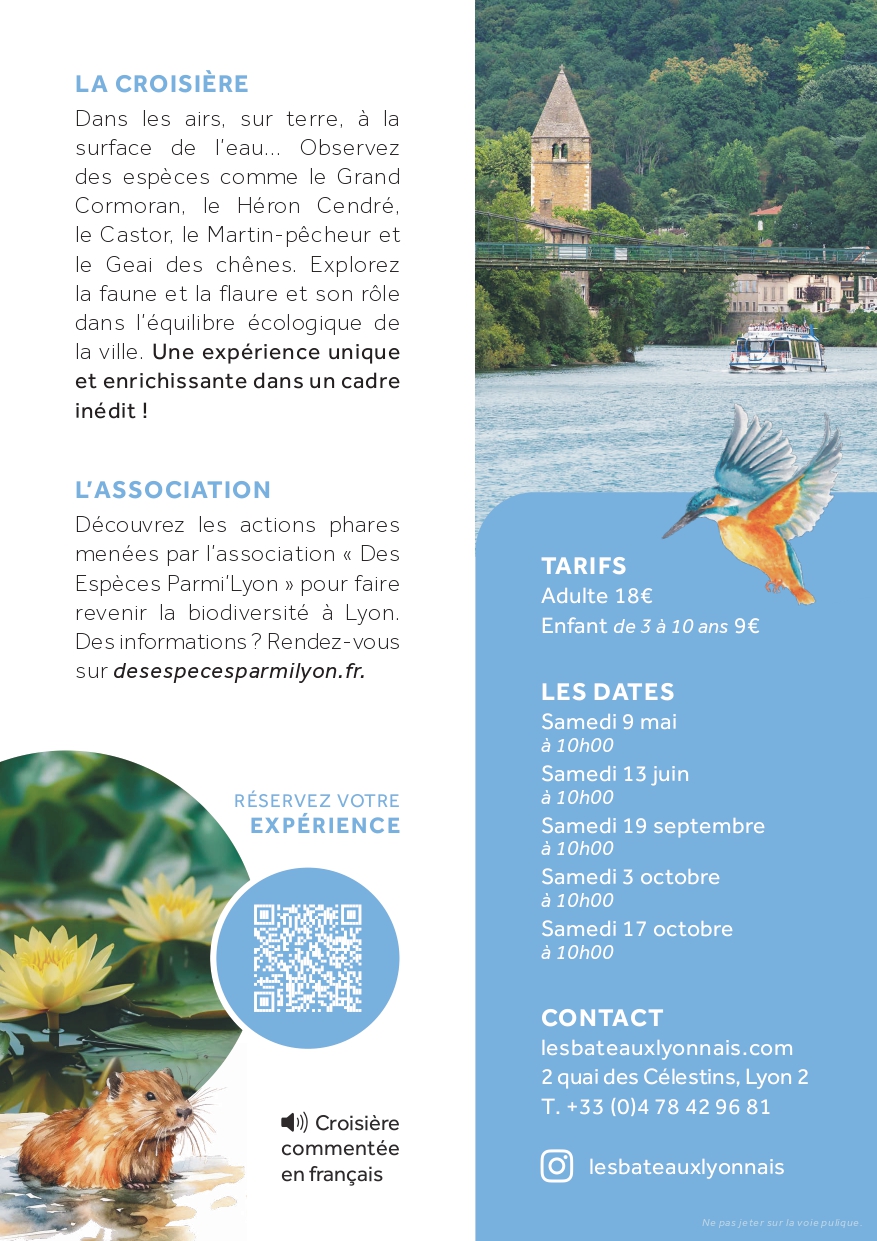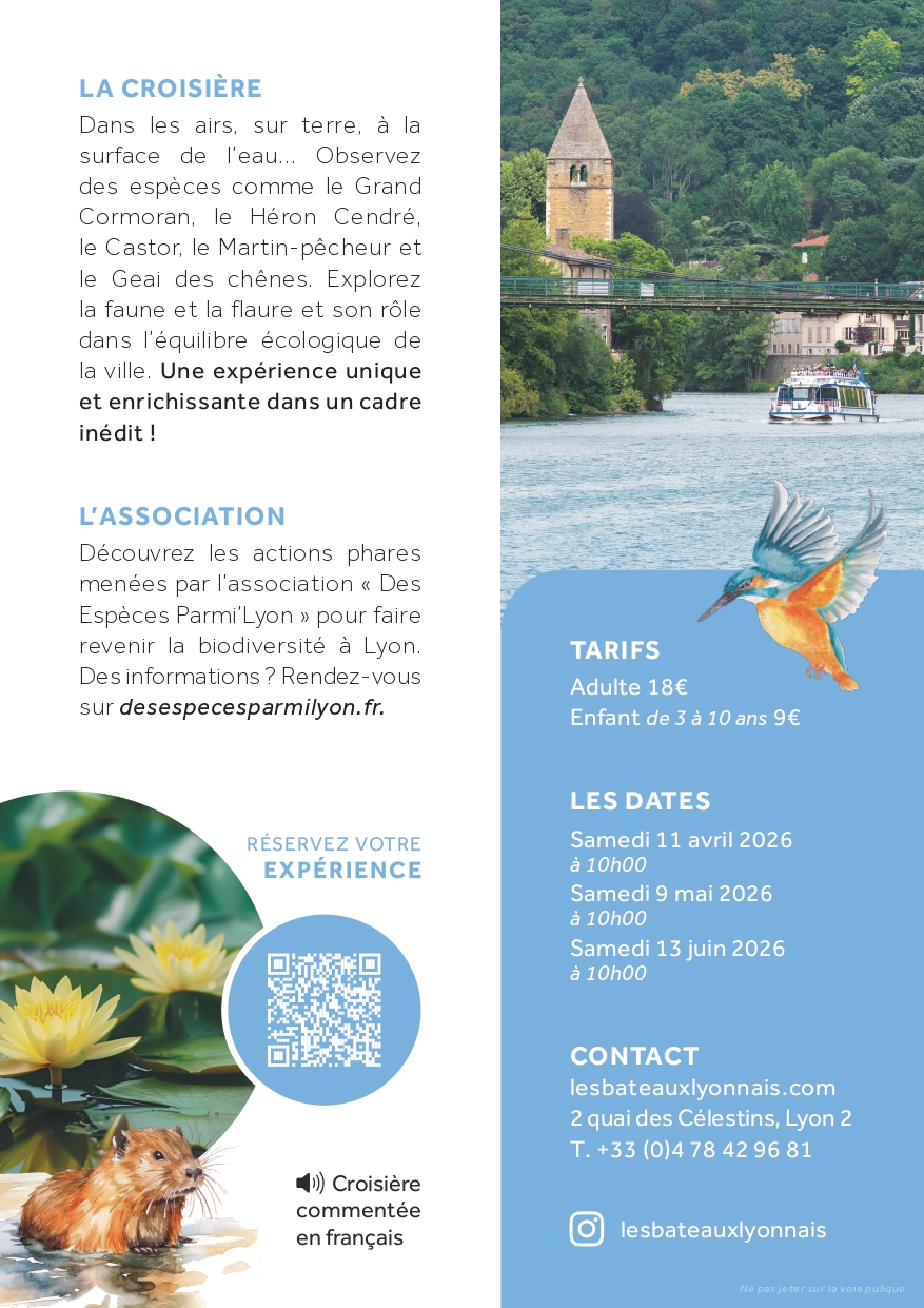 - 1 heure de croisière pour découvrir la biodiversité lyonnaise accompagné d'un naturaliste de l'association "des Espèces parmi'Lyon"
